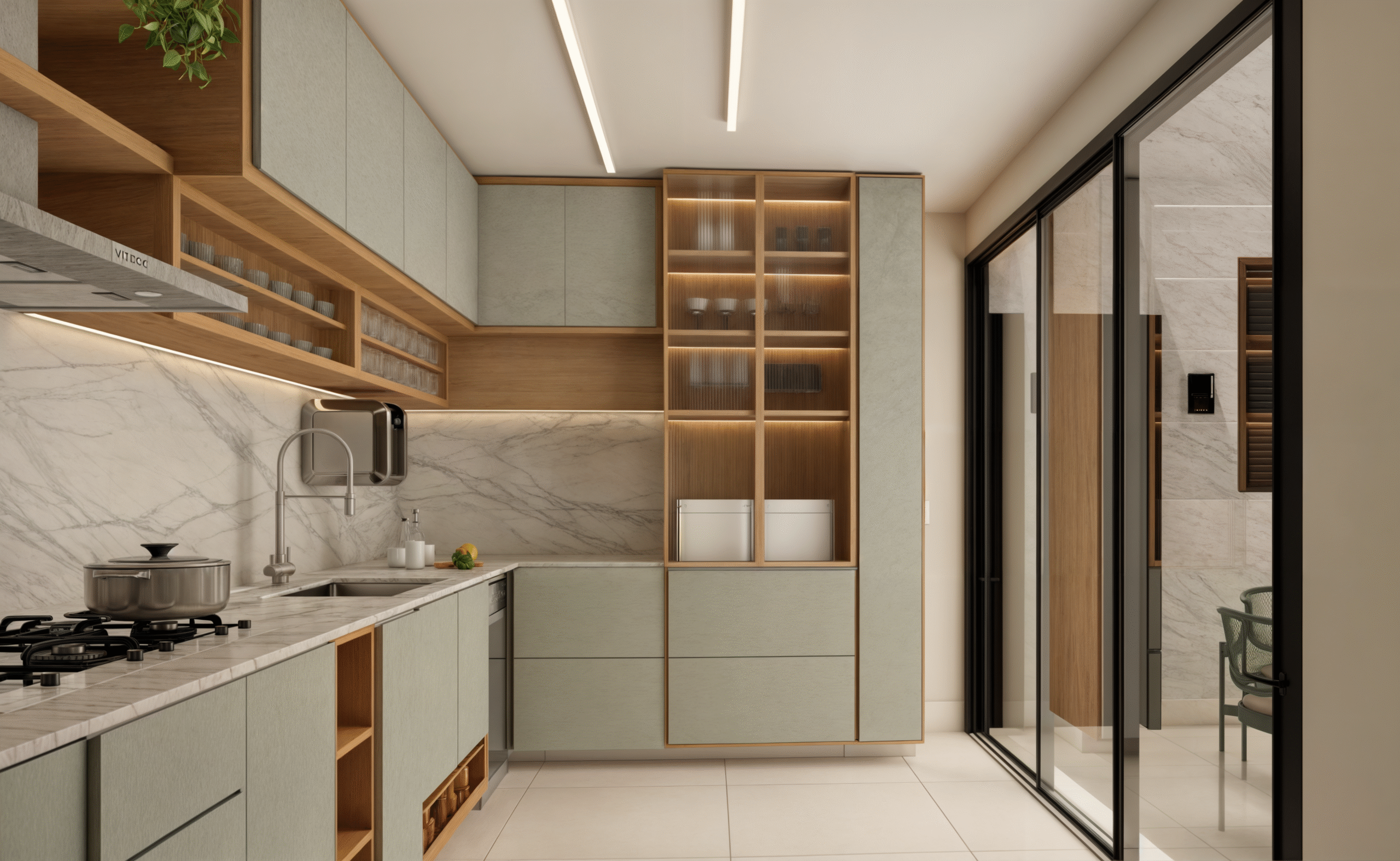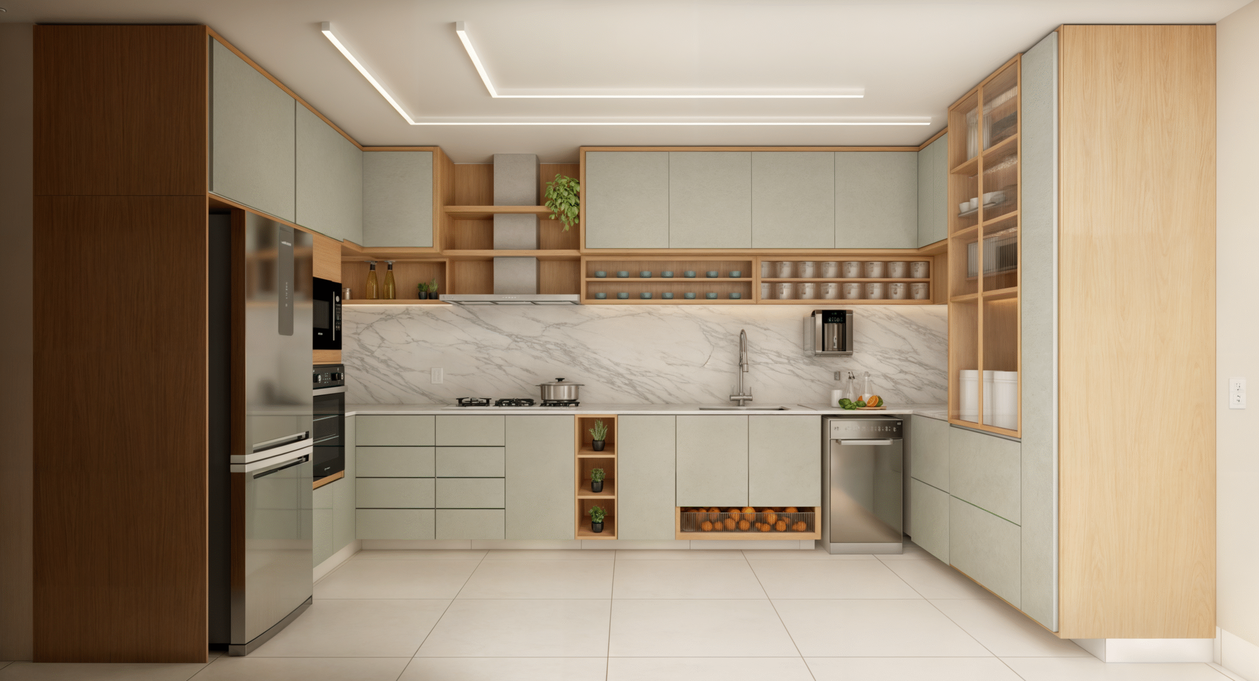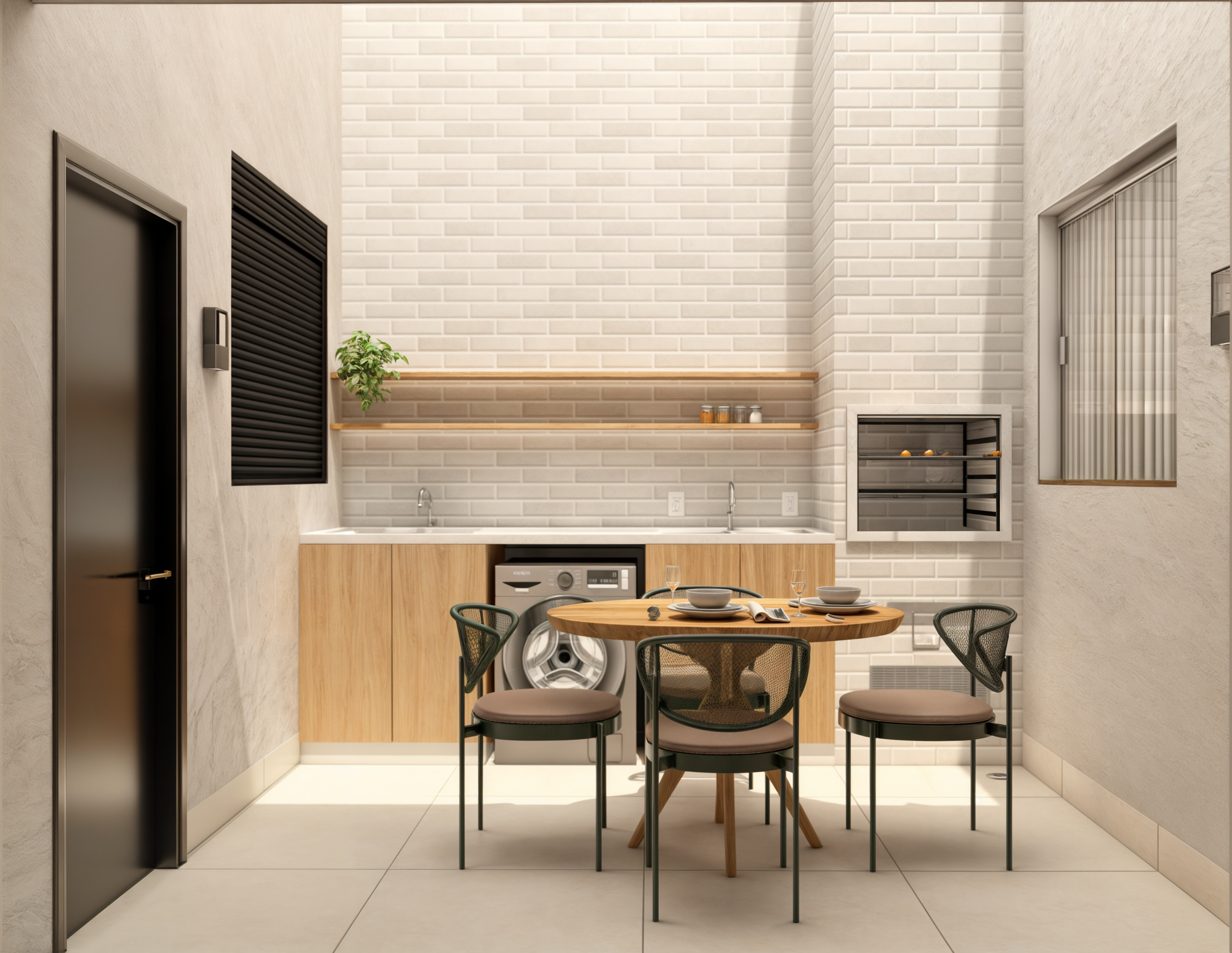 Um toque de cor para o coração da casa! A luz natural foi o complemento perfeito para esse projeto de interiores. A cozinha e área gourmet integradas foram projetadas com elementos como verde, amadeirado e vidros canelados, criando um ambiente vibrante e aconchegante.