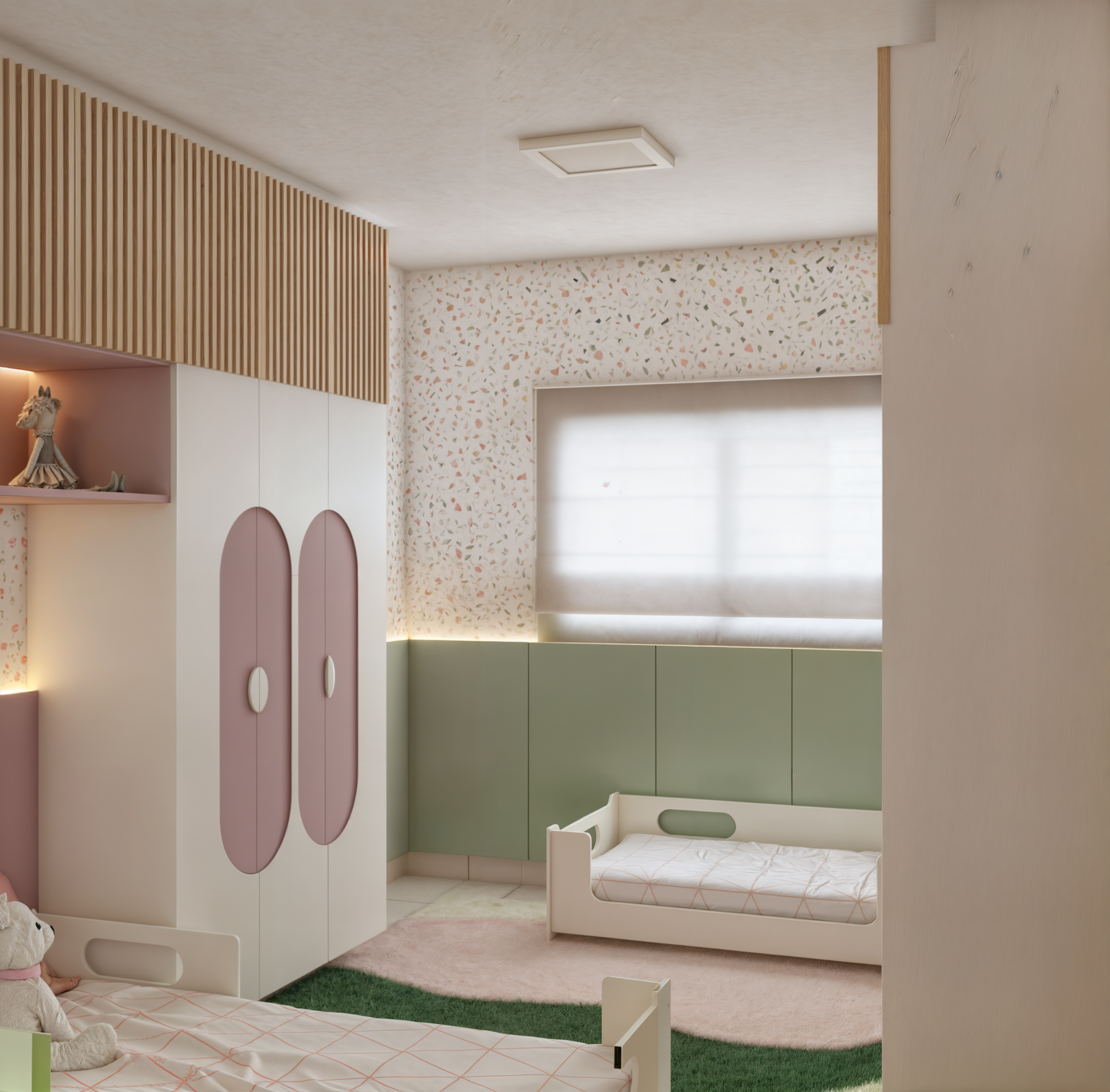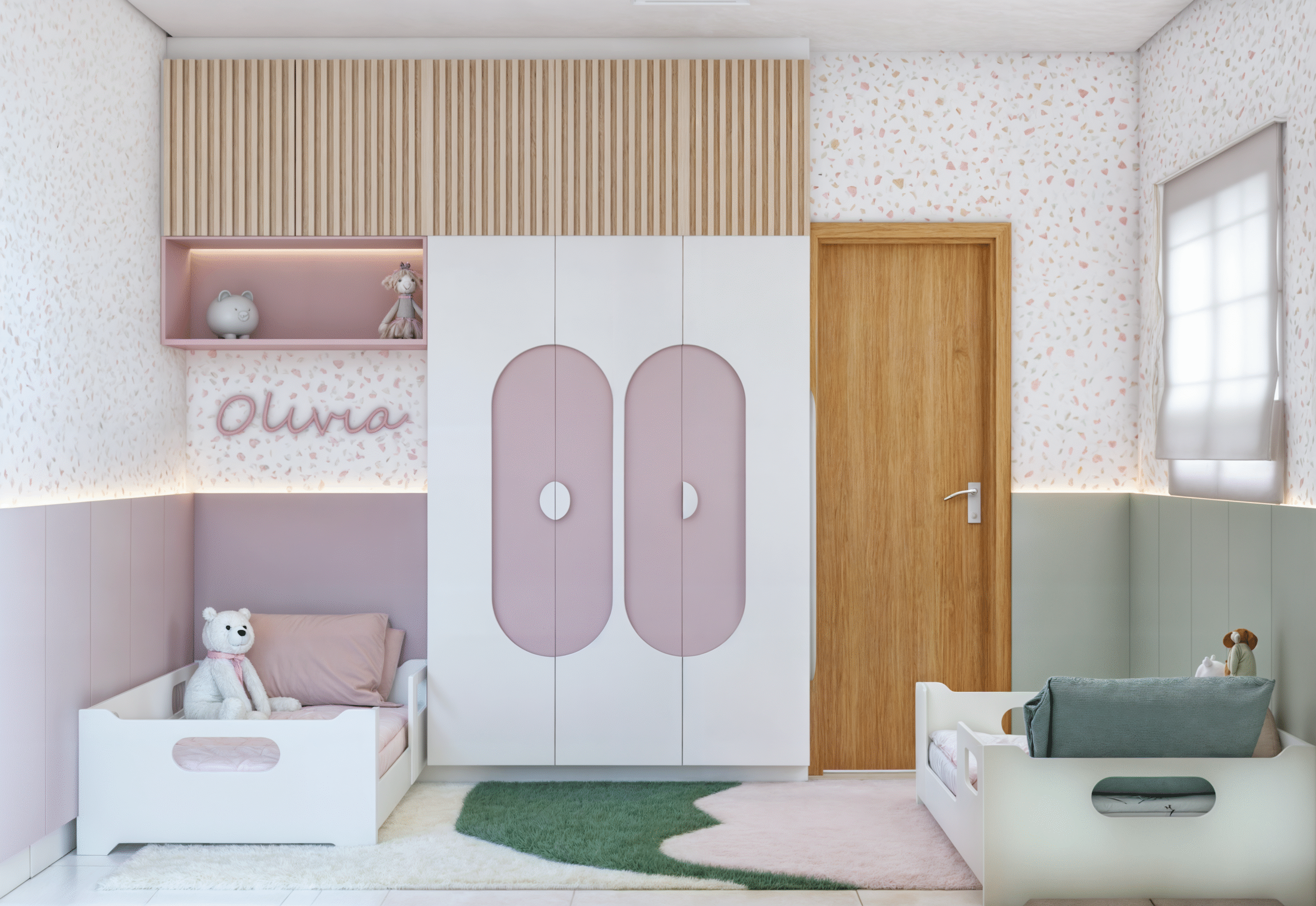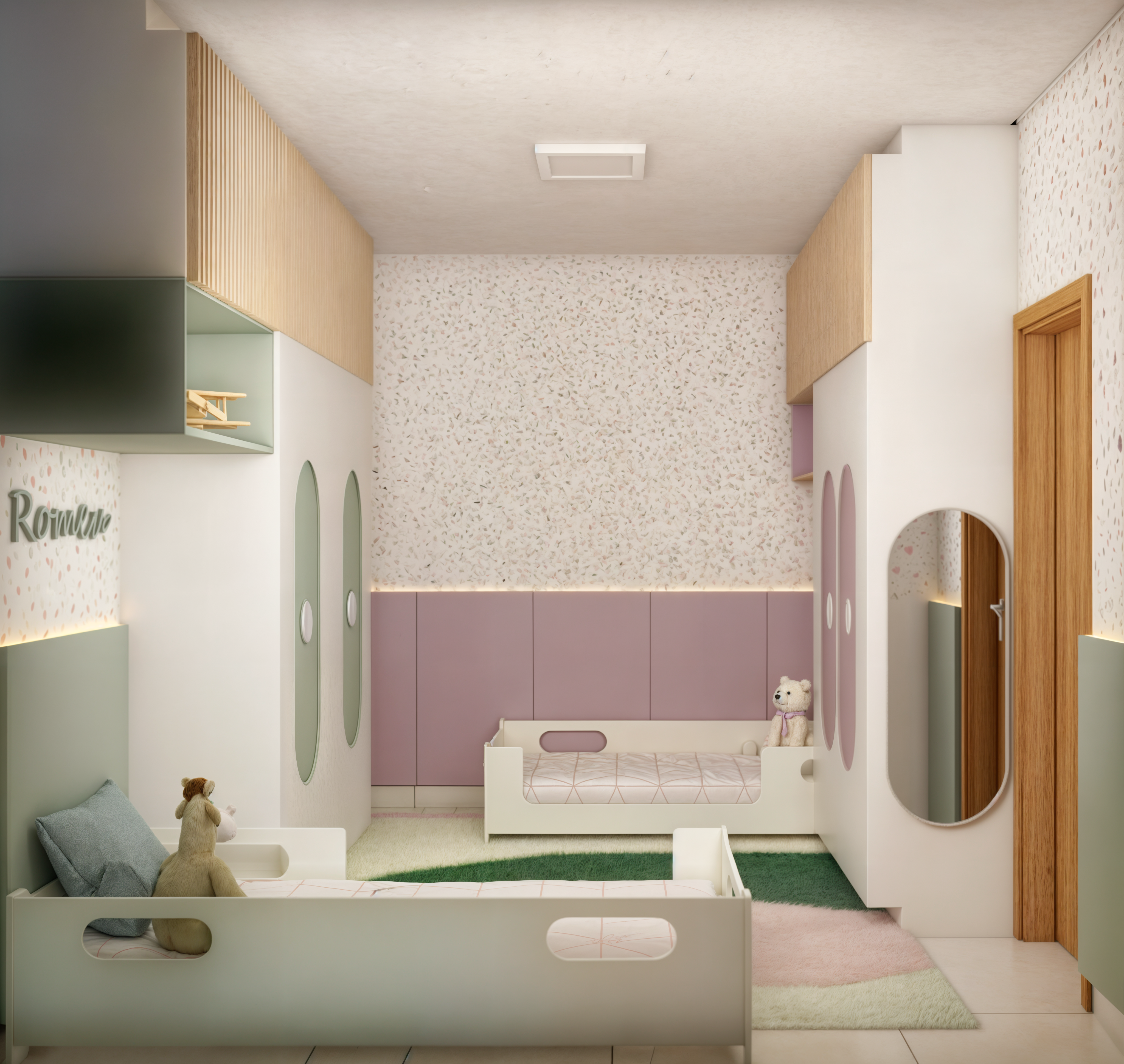 Romeu e Olívia, dois irmãos com personalidades únicas, agora têm seus próprios espaços em um quartinho compartilhado. Com cores em tons pastéis suaves e um papel de parede vibrante em granilite, criamos uma divisão harmoniosa que reflete a individualidade de cada um, tornando o espaço pequeno em um refúgio especial para ambos.